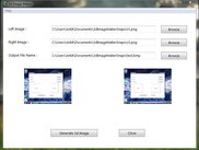 Generate 3d steroscopic image easily just by giving left and right image. Input image can be jpg, png, bmp, etc. Output format is uncompressed bitmap image.
